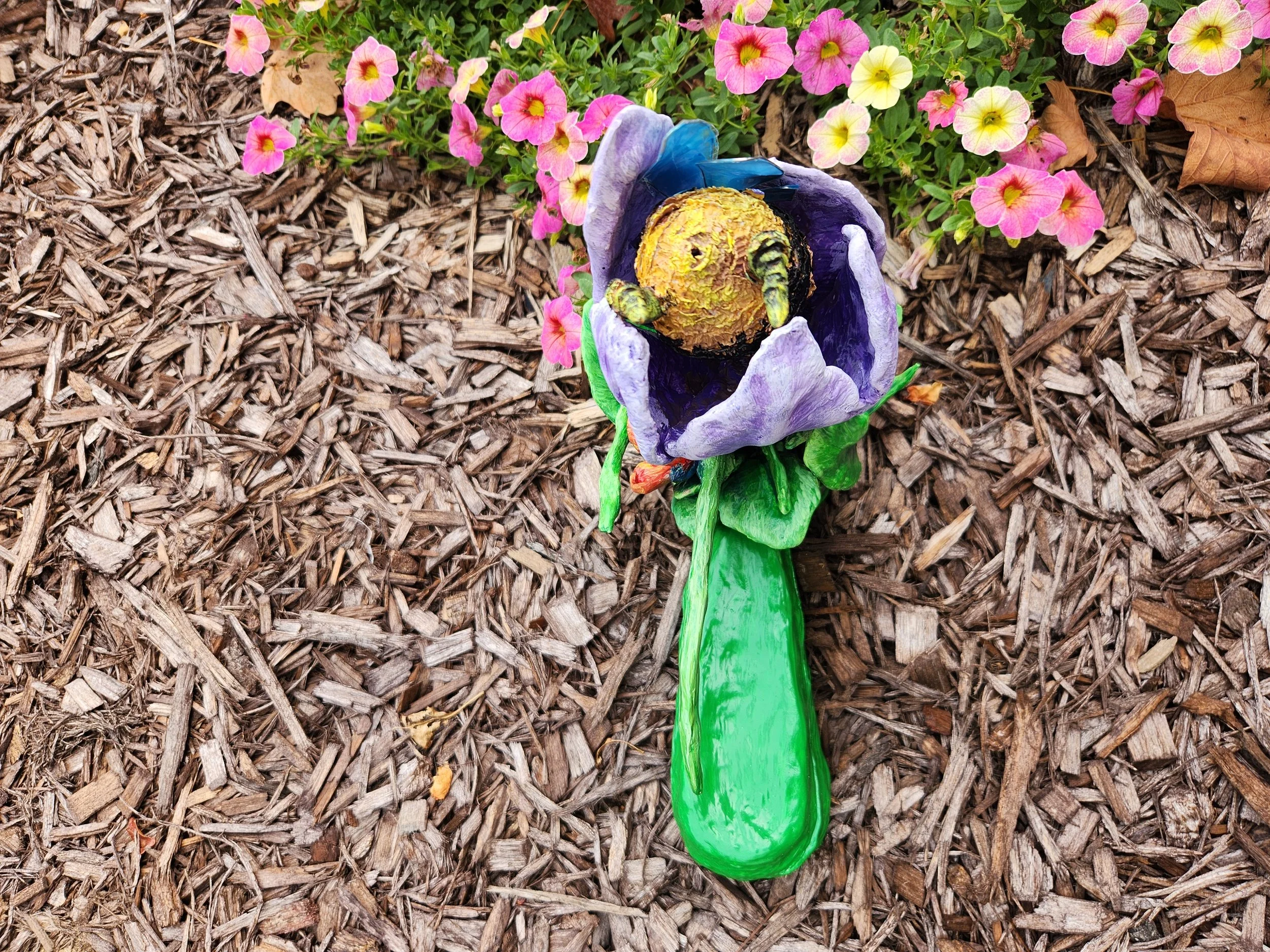 Made from clay with metal for support, a bee rests on a flower during its daily tasks.